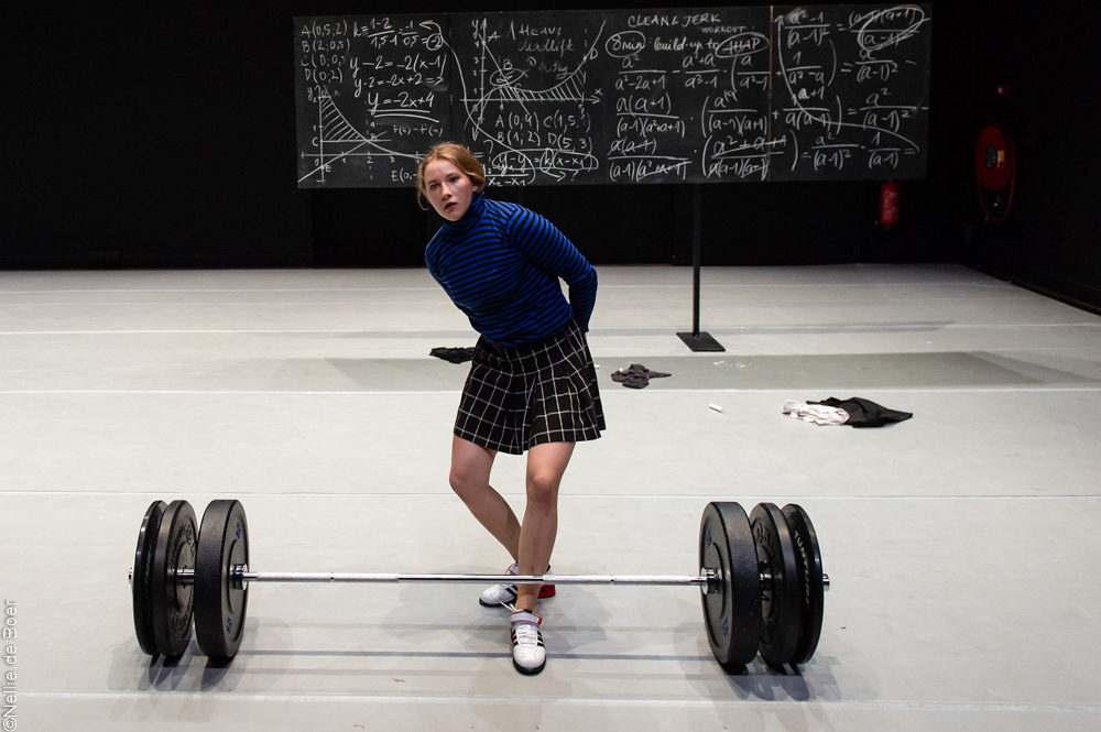 An elusive workout, ' B B ' approaches weightlifting with a dry sensuality, featuring a female lifter on a mathematical surface, working out possible exits and shifts in the already figured-out solutions. A practice of seemingly strong, yet fragile body, dependant on repetitive training and technically precise performance. How much of this strong body becomes illusive as it is loaded with the weights of limited functions and portrayals that are projected upon her? Attracted by the gaps between the already established structures, all that is left to linger is the lacking future - potential - to arrive to more spacious territories.